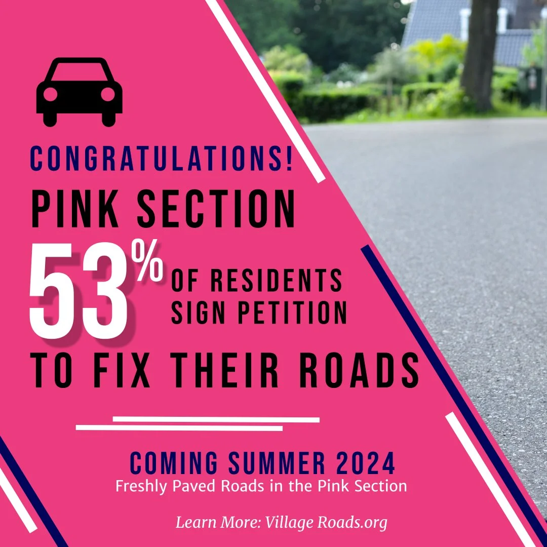 53% of the residents of the Pink section have said YES to fixing their roads and improving our community. Congratulations to the Pink section residents for their courage and foresight in coming together to address the problem our roads have become! Many, many thanks to the volunteers who worked tirelessly for so many months to contact residents and gather the signatures needed to move this effort forward. Congratulations!