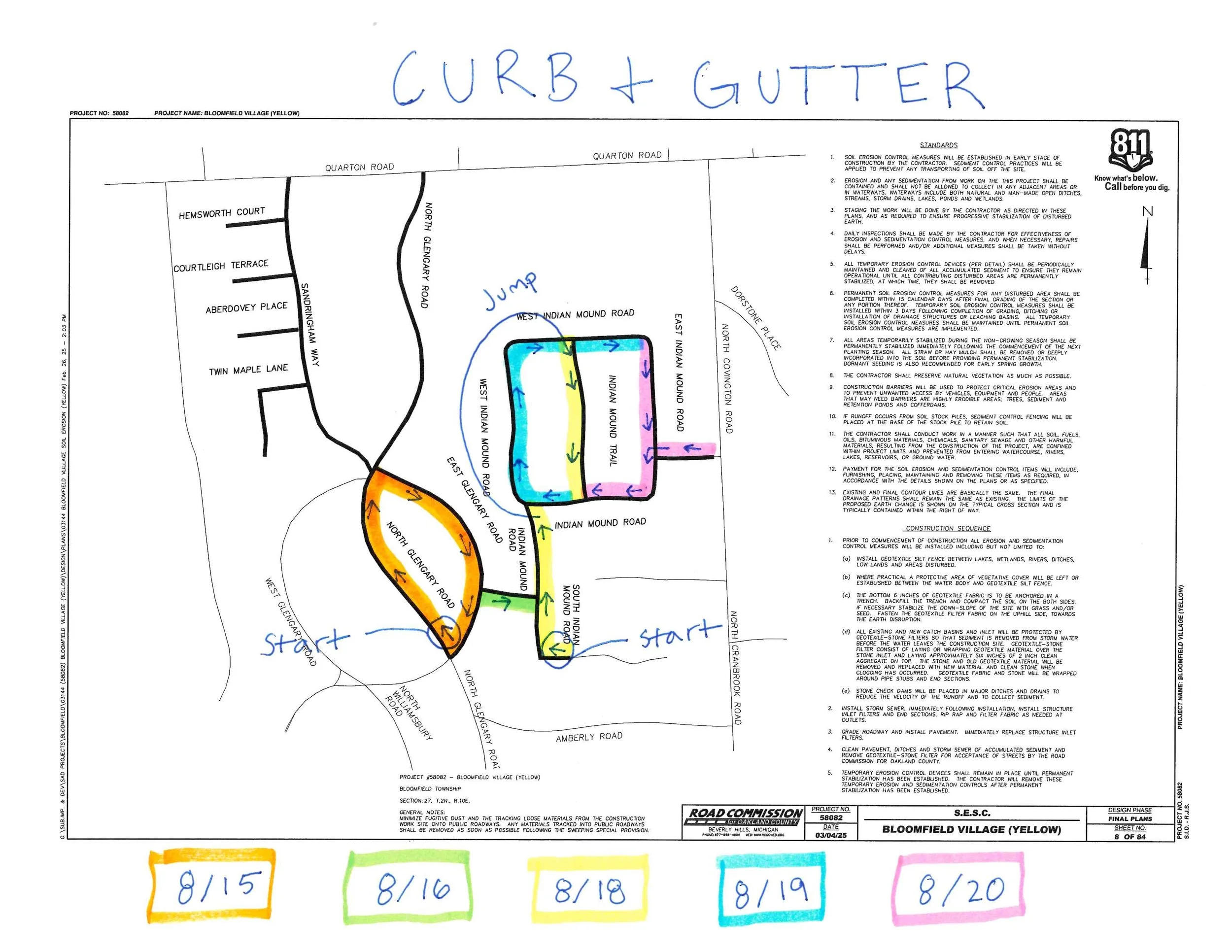 Indian Mound area curbing schedule. Work planned in part of the yellow section, and all of the blue and pink sections has been pushed back a day as described above.