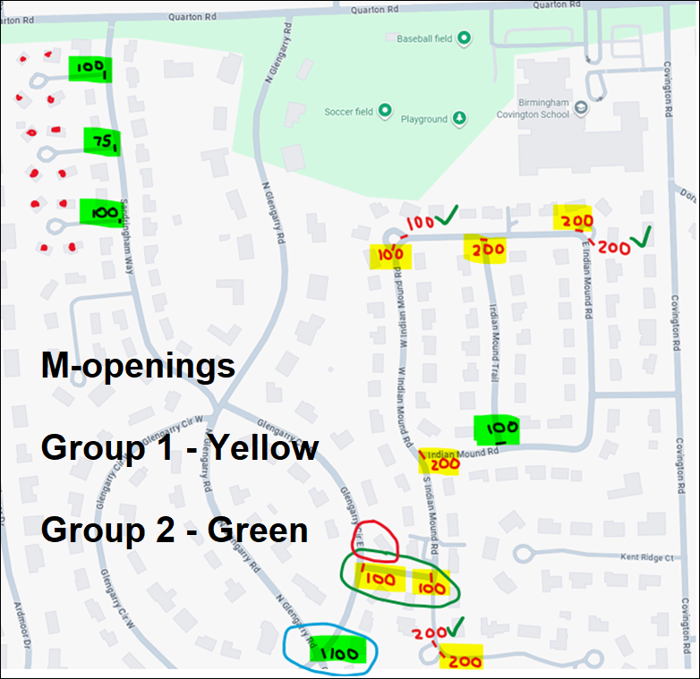 The first group of M-openings is being prepped today (11/3) and concrete will be poured tomorrow (Tuesday 11/4). These intersections will be closed for about 4-5 days. Please note the update in red below — this intersection has been added to allow the west entrance to Indian Mound to be re-opened more quickly. See map below.
